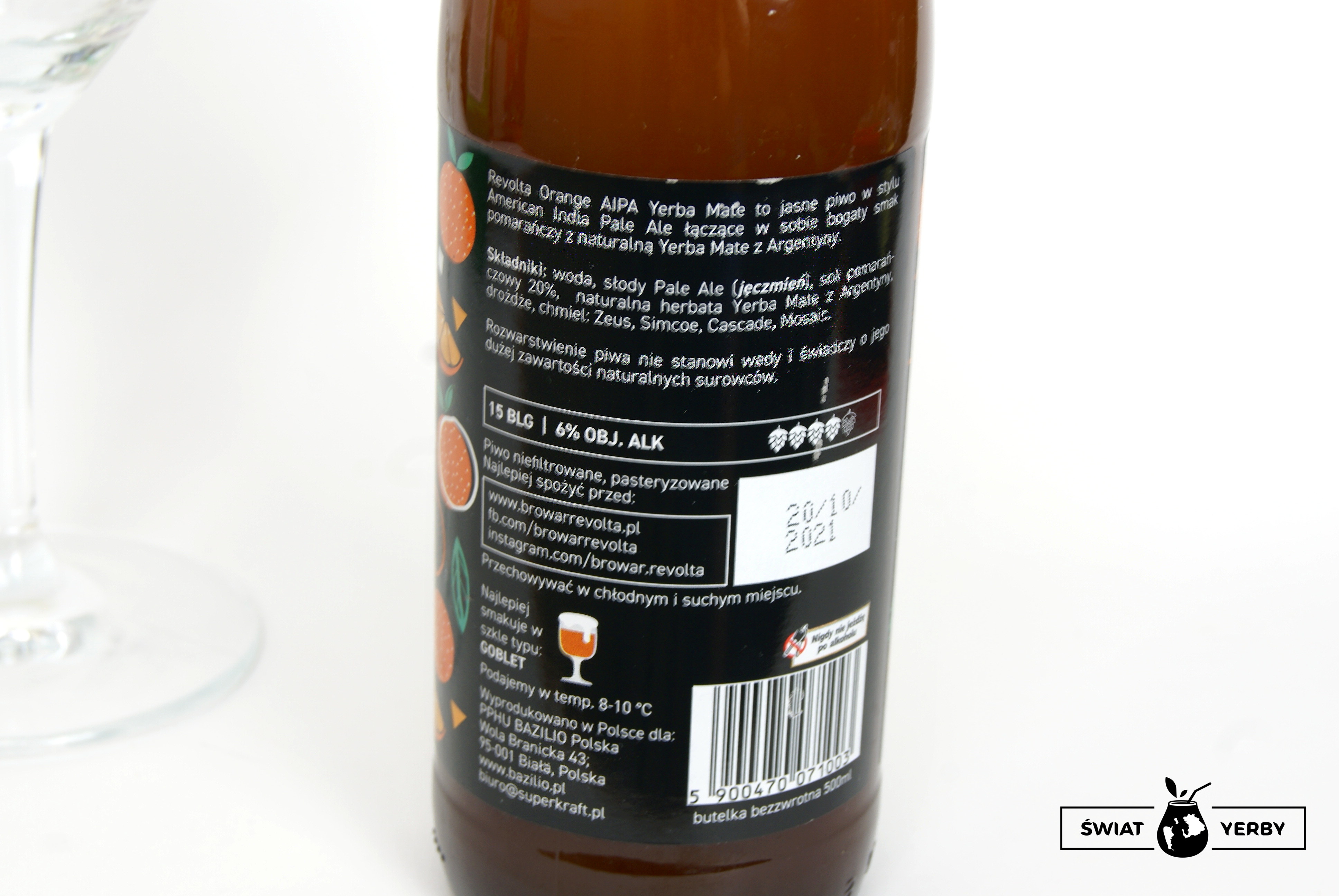 Skład piwa: woda, słody: Pale Ale (jęczmień), sok pomarańczowy 20%, naturalna herbata yerba mate z Argentyny (tak, widzę, że herbata. Tak jest na etykiecie 😀 ), drożdże